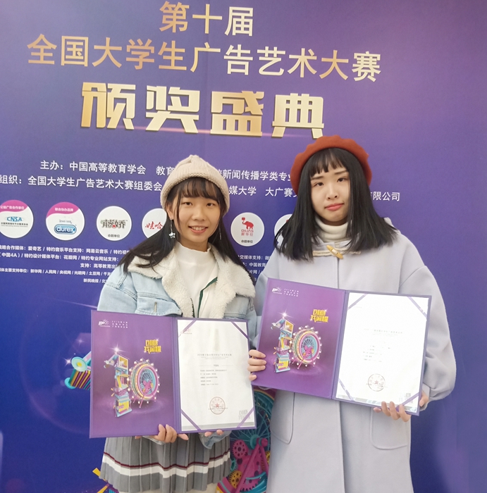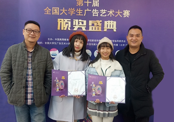第十届全国老员工广告艺术大赛颁奖典礼11月24日在北京举行。公司MK体育视觉传达系教师秦伟、李志明指导的两件员工作品获平面类全国二等奖,获奖师生受邀到现场领奖。获奖的作品分别是2015级员工张华雅、陈晓娴作品《“善心”“善言”“善行”》, 2015级员工叶姿彤、林东海作品《娃哈哈红枣、芒果饮品包装设计》;另外还有五件作品获得全国优秀奖。这是艺术公司设计系员工迄今所获得的最高奖项。