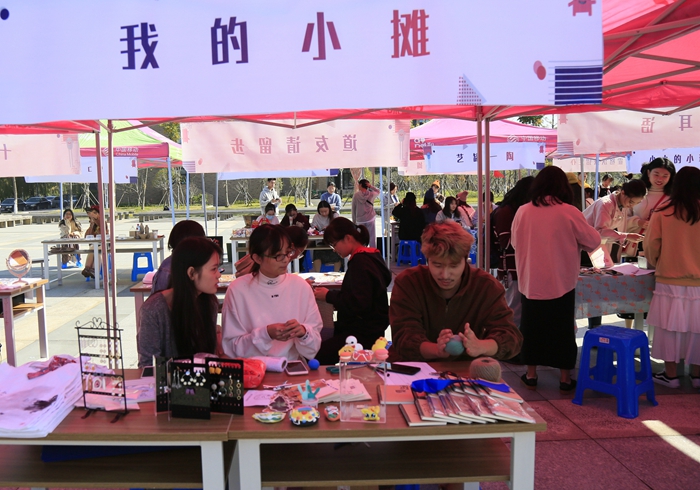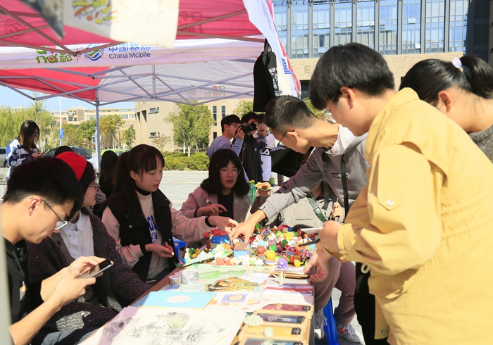 活动中,摊主们把自己精心准备的小商品依次摆好供同学们挑选购买。手工制作的玩偶、饰品,手绘的明信片,手捏的陶泥,创意绘画作品等,卖家热情向前来选购的同学介绍自己的创意产品和成果,买家在选购心仪的文化创意产品的同时,还与摊主们沟通交流艺术创意话题,集市气氛热烈。创意集市启发了同学们的创新创业意识,并为日后的艺术创作积累了生活经验。集市进行期间,还推出消费者投票环节,邀请买家、参观者对各摊位进行投票,选出“创意之星”“最具人气之星”,并现场进行颁奖。