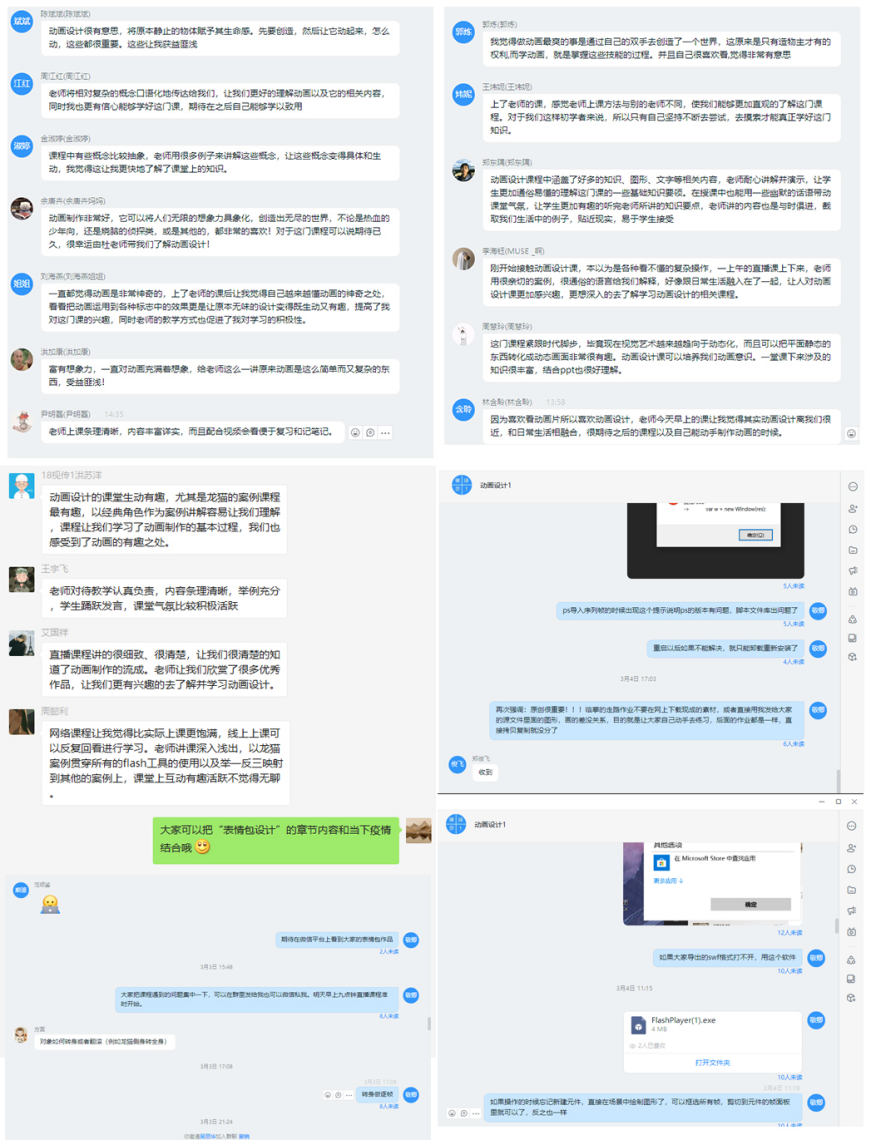 “非常时期”的《动画设计》课程充分挖掘线上教学的优势,试图解决有限课时量与教学任务要求之间的矛盾,尝试探索一门“学以致用,关注生活”的趣味线上专业课。为了上好这门课,杜敬卿老师做了大量的教学准备工作,充分利用各种线上平台的特点和优势,多平台结合开展线上教学。一是在超星学习通平台建课程,发布图文资料、课件、作业,统计考勤等,检查并督促员工自主学习;二是利用钉钉群进行线上直播课程,主要任务是在线讲解、讨论互动;三是结合微信平台的课后交流群,主要用于实时答疑、课程拓展。通过这种教学理念和教学方式,师生互动更加放松、高效,员工把动态图形制作成表情包并上传至社交媒体平台,宣传疫情防疫,让创作走进生活,学以致用。