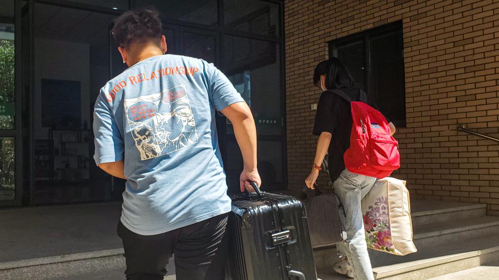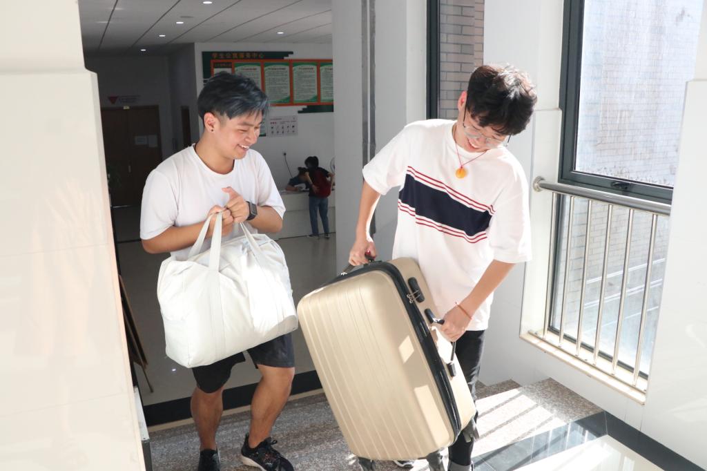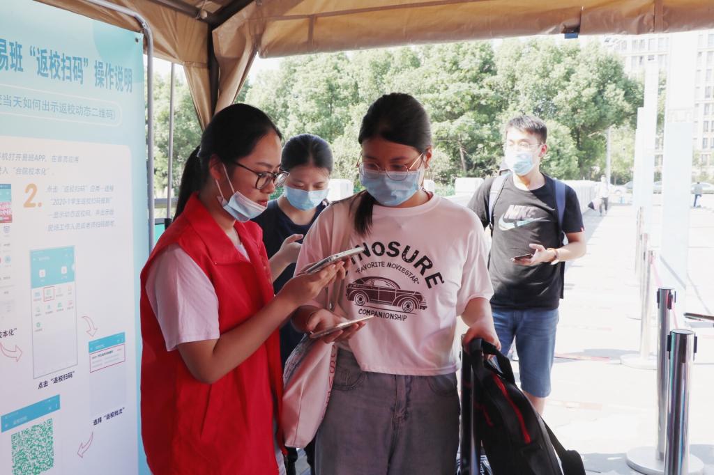 员工志愿者们顶着烈日,有的守在门口为返校同学扫码,有的穿梭在校园大门口和宿舍楼,为返校同学接下一个一个的行李箱。傍晚时分,志愿者们才停下匆忙的脚步。两天下来,志愿者们腰酸手酸,但他们说只要看见同学们的笑容和听到那句“谢谢”,所有的苦与累都烟消云散了。