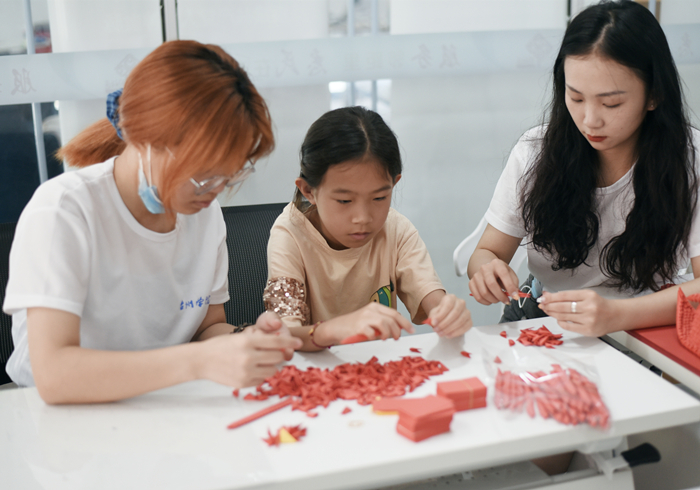 据介绍,该活动团队员工们立足专业特色,整合优势资源,围绕"红色精神纸上现"主题,采用剪纸、衍纸、折纸、手工钩针、布艺等艺术形式,教授社区居民制作三角插红船、衍纸中国地图、建党百年剪纸、手工口金包等红色手工产品。
