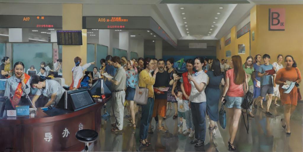 巨幅油画创作《最多跑一次》,采用全景式构图,以亲历者的视角展现了台州市政府行政服务中心 “最多跑一次”的服务窗口。画面主要由3个既相对独立、又巧妙结合起来的段落构成,形成完整有机的画面。创作采用了古典写实的手法,构图严谨、造型生动、空间井然有序,众多人物与大理石地面的光影关系形成了奇妙的美学效果,犹如一场视觉的交响曲。这种崇高与现实的交汇,用以体现我们党和政府以人为本、践行以人民为中心发展思想的改革举措,恰如其份。我们可以非常直观地感受到,古典写实油画技法应用于现实主义题材所带来的视觉震撼。