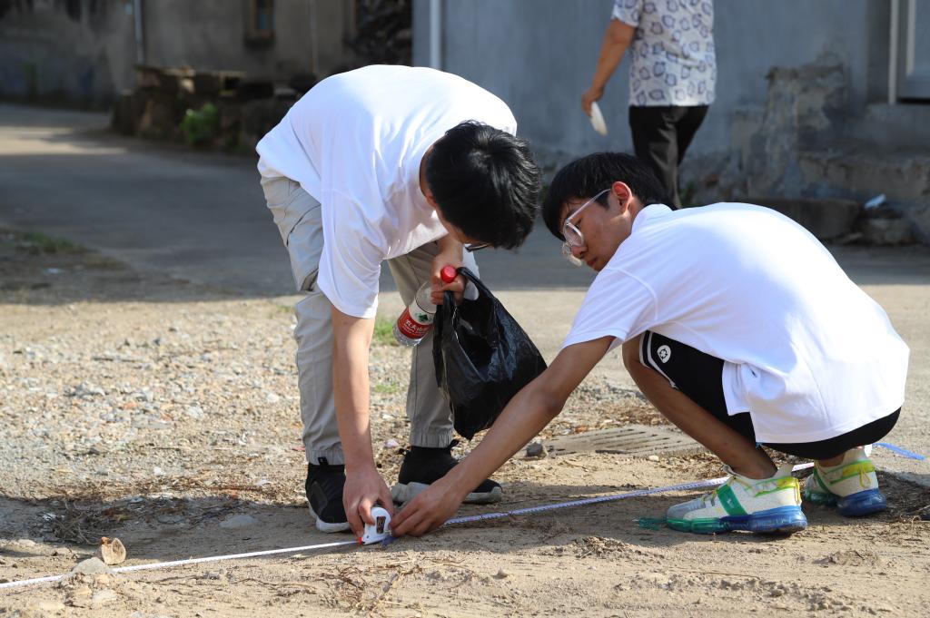 当天,在参加完简短而又隆重的社会实践基地揭牌仪式后,实践队师生一行12人,便马不停蹄的投入了工作,他们顶着38度的高温,拿着相机、皮尺和文件夹奔赴河头镇的各个点位,认真记录各项数据。