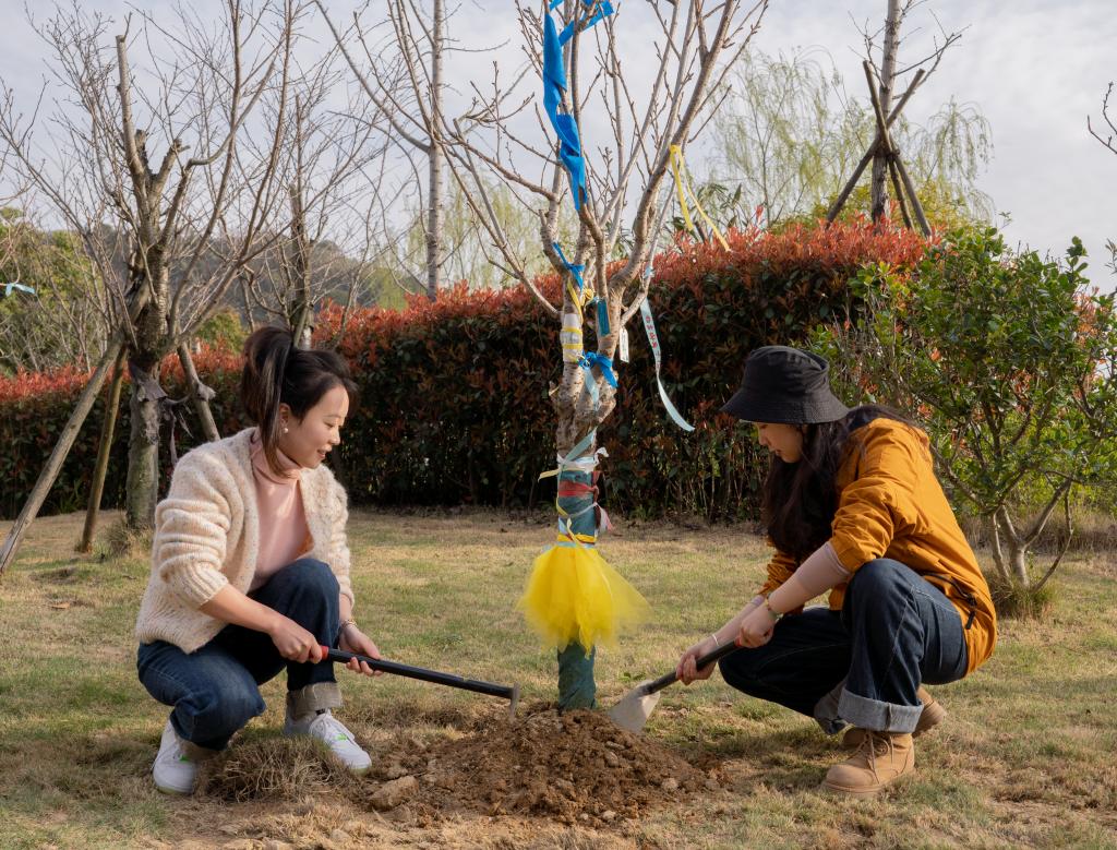 3月12日,正值我国第45个全民义务植树节,两位员工专程赶回母校,亲手将树种植到了艺术大楼南面的绿地上。