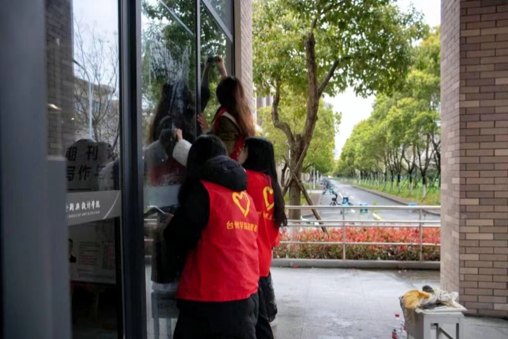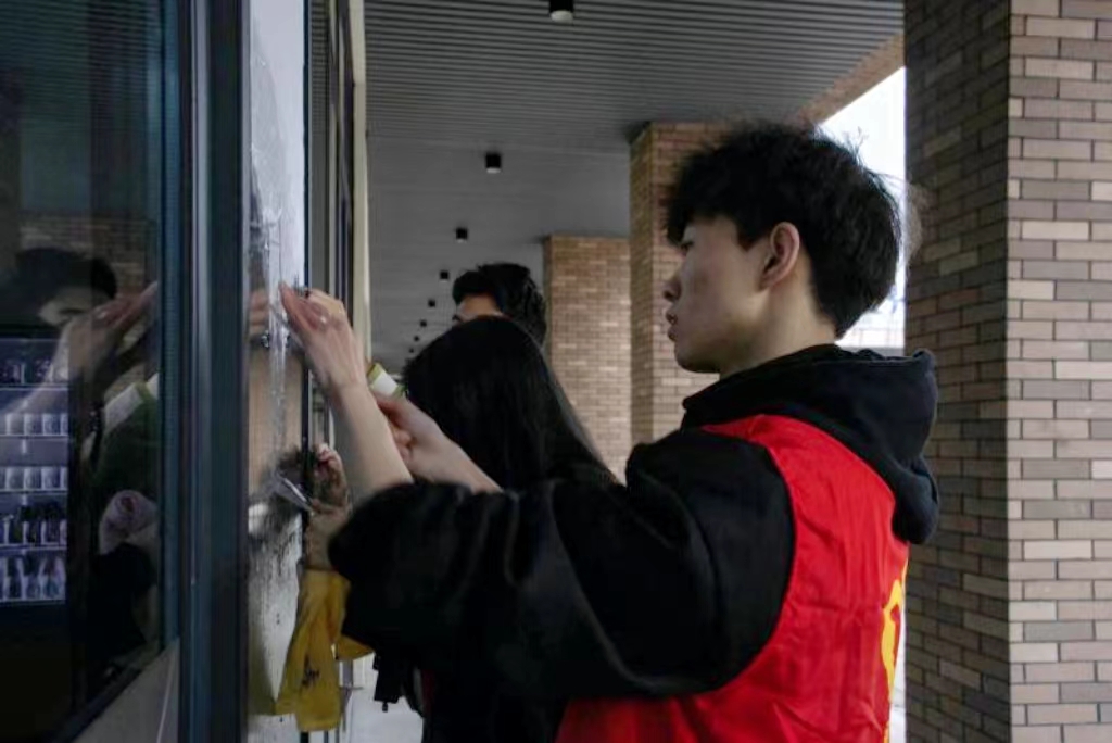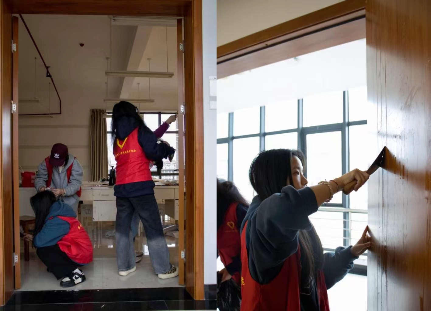 在简短的分工后,志愿者们依次领取垃圾袋、清洁铲刀、钢丝球、酒精等清洁工具,大家穿上红马甲,有条不紊地对音乐厅、教室及办公室进行清理。志愿者悉心关注每一处细节,瓷砖与墙面在他们细致周到的处理下光亮平滑、焕然一新,志愿者们用自己的真诚与热情为大家打造了一个安全、舒适、卫生的学习环境。