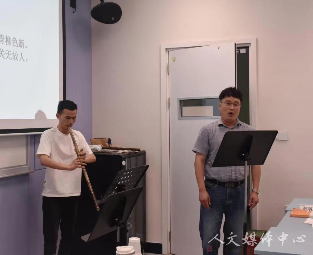 随后,为了让同学们深刻感受诗词的演唱方式和技巧,孔春恒和何金龙两位老师现场合作了《送元二使安西》。孔老师演唱技巧高超,歌声雄壮浑厚,使人身临其境。何老师使用笛子合奏,笛声悲昂,烘托了现场氛围。二位老师高超的演奏技术令现场观众仿佛真的置身那场离别之中。