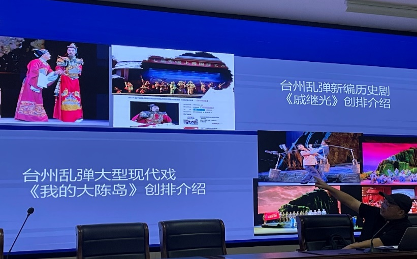 尚文波首先介绍了台州乱弹是浙江台州唯一的地方剧种,首批国家级非物质文化遗产项目,是浙江省四大乱弹之一,也是唯一保留“乱弹”命名的剧种。目前全团共有演职人员80多人,复排、创排16本大戏和30多出折子戏。6次出国、7次央视、9次进京演出,并在全国、省级业内各大会议先后6次作典型交流发言。