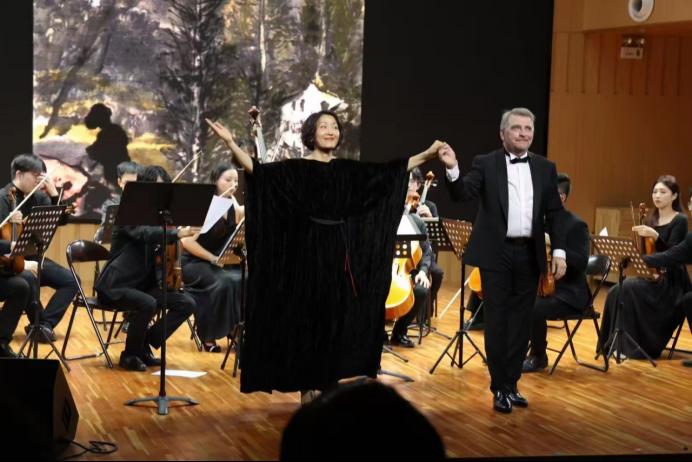 舞台上,音乐家们动情地演绎着乐曲,大屏上滚动播放着吴立民先生的绘画作品。邱曙苇的声音如同晨曦中的阳光,温暖而诗意,清澈而充满力量;吴立民的绘画如同深邃广阔的交响曲,丰富而深刻,吟唱了生命的悲欣交集。这是一场法兰西的歌声与中国水墨的美妙邂逅,跨越时间与空间的界限,创造出无尽的可能性。