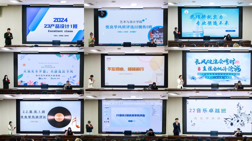 在现场汇报中,18个班级围绕“思想政治教育、班委会建设、班级文化、班级学风管理、学风建设行为管理、创新创业竞赛、计划落实情况”等多层次多方面地进行班级学风建设汇报与成果展示,展现了班级队伍建设的风采,彰显出艺设学子认真负责、力争上游的工作态度与精神面貌。