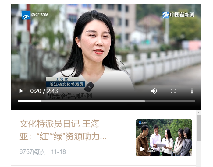 2024年11月19日,浙江卫视以《文化特派员日记 王海亚:“红”“绿”资源助力芹溪美丽蜕变》为题,对公司MK体育王海亚老师的文化特派员工作进行报道。