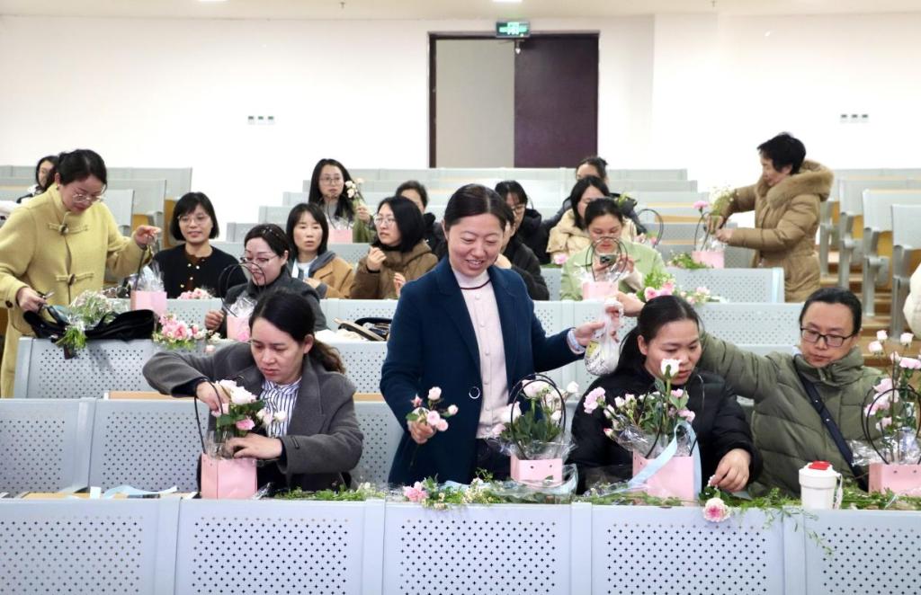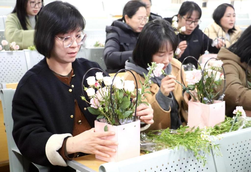 紧接着,“匠心花语·她力量”插花活动拉开序幕。花香弥漫的现场,女教师们围坐一起,聚精会神地聆听花艺老师的技巧讲解。剪刀在她们手中灵巧地穿梭于花枝之间,每一次剪切都谨慎细致,玫瑰、康乃馨在她们的巧手之下重焕生机,每一篮作品都展现了她们对美的独到理解和深厚情感。