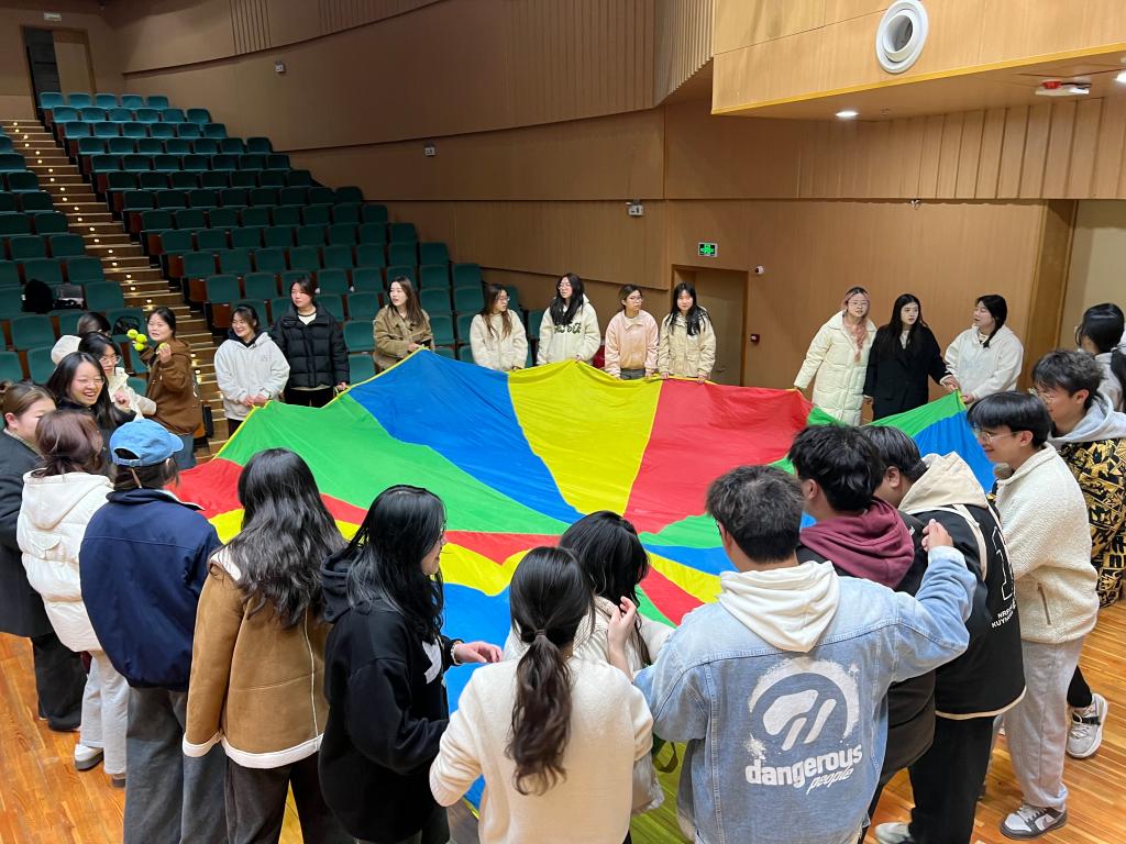 与传统单向授课不同,此次教学活动以“律动+共创”为核心,设置音乐即兴互动、彩虹伞团队游戏、小乐器组合创编等环节。参与者化身“音乐玩家”,在两位老师的引导下,用身体感知节奏、用协作编织旋律。彩虹伞随音符起伏跃动,小乐器碰撞出即兴火花,团队创编环节更催生出跨专业的创意交响。这种“玩中学”的模式,不仅强化了员工作为未来音乐教师的创新力、组织力与协作力,更在欢乐氛围中悄然达成心理解压与情感联结的隐性目标。