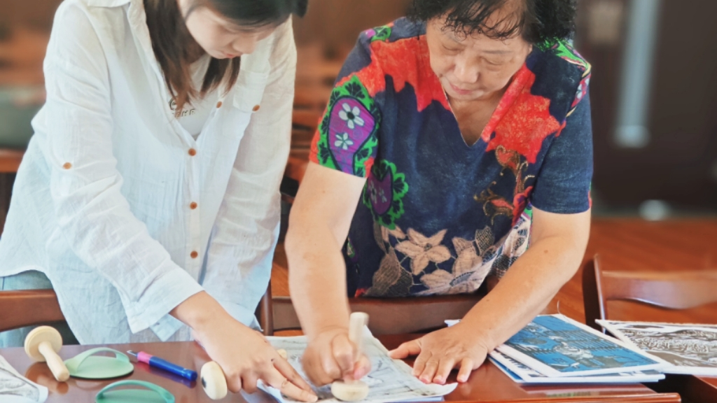 在白云街道云海社区党建活动中心,实践团队以红色版画精神、廉洁文化为创作主题开展版画教学。美术专业员工王薇详细介绍革命版画历史与文化内涵。队员们手把手指导当地居民刻刀雕刻、上墨、印刷等操作流程,并时刻叮嘱大家注意刻刀使用安全。一位带孙女参与的居民表示:“第一次亲手刻版画,这样的活动既有意义又有温度!”