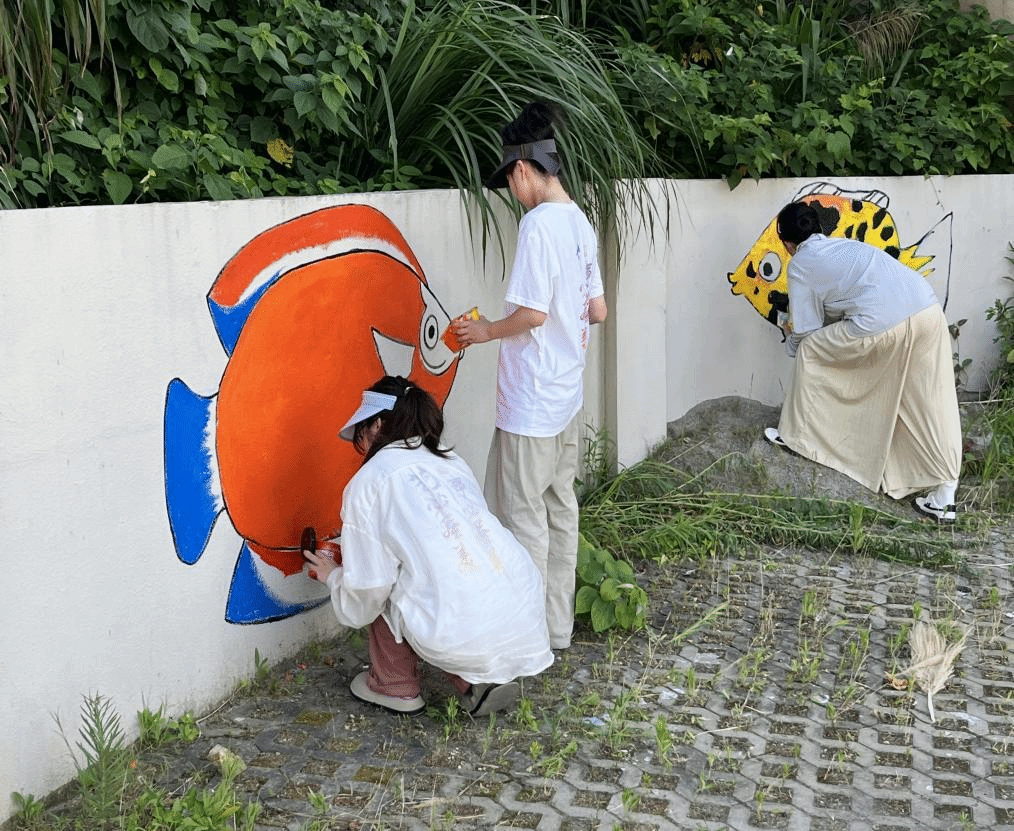 实践队深入走访当地村民,充分发挥艺术设计专业特长,巧妙融合廉洁元素与渔岛风情,开展大陈岛墙绘创作,美化大陈人文景观,助力清廉乡村建设。师生们不惧烈日,奋笔创作,通过墙绘形式再现了甲午岩的壮丽、垦荒碑的庄重以及新老队员接力奋斗的场景,展现了廉洁文化的精髓与大陈岛民的渔耕生活。这些墙绘作品成为环岛公路上一道独特的风景线,吸引着岛民及游客纷纷驻足观赏,不仅为美丽乡村增添别样的色彩,也在潜移默化中滋润了当地居民的精神土壤。