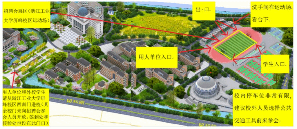 2、欢迎广大2023届毕业生参加,请于13:00后排队入场(请从校区指示图所示入口进入运动场)。省内高校若统一组织员工参会,请填报车辆、带队老师和参会员工信息,于3月16日17:00前将组团参会回执(见附件四)发送至邮箱:jyb@zjut.edu.cn,联系人:周老师,电话:0571-88320033;自行前往的外校员工请于3月11日8:00-3月16日17:00扫描下方二维码进行单独预约。招聘会当天凭员工证原件和手机短信获取的校园通行码(3月18日上午前会发短信到预约时填报手机号,凭短信内容领取通行码)进校。组团参会和自行前往参会的外校员工从浙江工业大学屏峰校区西南门入校(详见文末示意图,其余校门无法入校参会)。